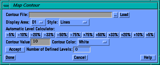 Selecting one of these buttons will place a calculated contour level into the Contour Value text box. The buttons -5%, -10%, -20%, -33%, -50%, -75% will take thet percentage of the contour minimum value (presumed to be negative); the buttons labelled +75%, +50%, +33%, +20%, +10%, 5% will take that percentage of the map maximum value (presumed to be positive). You will then choose a color and press the Accept button to proceed.