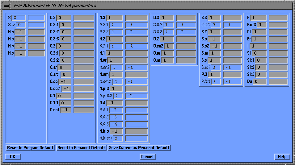 The Advanced H-Val Parameter set allows up to two parameters for each atom type. Both must be integers, preferably in the range -5 to 5. Note that an empty cell is not the same as a zero value. Zero must be explicitly specified. The atom type set used by HASL is an extension of the Tripos Force Field set and is described below.