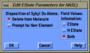Set the Information parameter to the type of EState information you wish to be exported to the HASL model. The three options are: EState using the standard EState paradigm for calculation of the atom-based indices, H EState which calculates an atomistic parameter set localized on the attached hydrogens or Both.