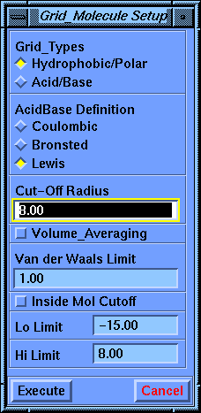 The Grid_Types parameter allows the specification of the information to be calculated by the HintGrid command. Alternately, you can calculate a map where the positive grid values represent hydrophobic regions and negative grid values represent polar regions or a map where the polar information has been categorized into acidic regions and polar regions (at the expense of the hydrophobic information which is lost). If all three types of infomation are desired, you will have to run two HINT map calculations. The available Grid Type options are: