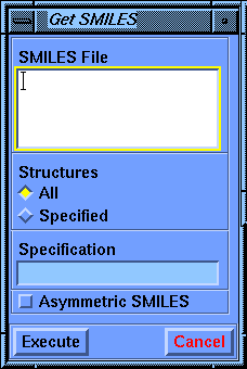 The Specification parameter designates the name or names of molecules to be retrieved from the SMILES File. Standard InsightII wildcards can be used in the specification; e.g., *cyclo*, benz*, etc.