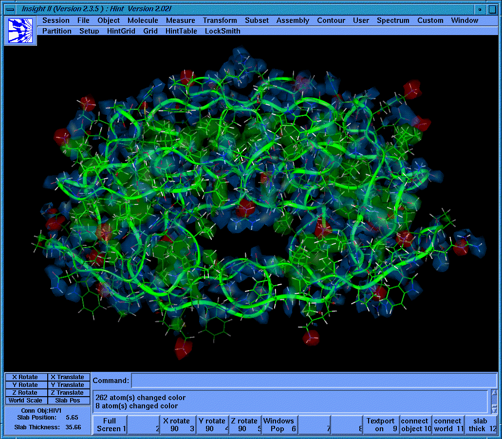 When this second map calculation is complete (about 1/2 hour) you may contour the HintGrid maps for display. Go to the Grid pulldown on the Hint menu bar and select the Contour command. First select the Grid Object box and pick HIV1_HP from the associated Value Aid. Next select the Contour Name Root box and enter HIVH. This will be the root portion of all Contour Objects created from HIV_HP. For the Contour Select parameter pick the Single Value option. Contour the Hydrophobic portion of this map. Enter a value of 10.0 for the Contour Level and pick a green for the Contour Color parameter. Now select the Grid Object box and pick HIV1_AB from the associated Value Aid. Next select the Contour Name Root box and enter HIVP. Contour this map with -20.0 (red) and 20.0 (blue). This display shows hydrophobic regions and differentiates between two types of Polar regions (Acid-like and Base-like) based on Lewis definitions of acids and bases.