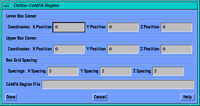 These fields define the coordinates for the upper corner of a box in cartesian space. The box is totally defined when its lower corner coordinates and grid spacing are also set. Press Accept for each box you wish to define in the region; press Done to write the region.