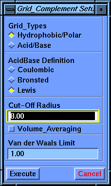 The Grid_Types parameter allows the specification of the information to be calculated by the HintGrid command. Alternately, you can calculate a map where the positive grid values represent hydrophobic regions and negative grid values represent polar regions or a map where the polar information has been categorized into acidic regions and polar regions (at the expense of the hydrophobic information which is lost). If all three types of infomation are desired, you will have to run two HINT map calculations. The available Grid Type options are: