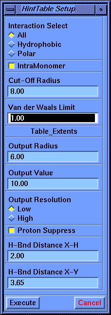 The Table Extents parameters are used to filter the quantity of data written to the HintTable file. Without filtering the HintTable can become exceedingly large. For instance, a interaction calculation between two subunits of a protein, each possessing 10^3 atoms would yield 10^6 data records in an unfiltered HintTable. Interactions between atoms that are farther apart than the Output Radius parameter are not written to the file.