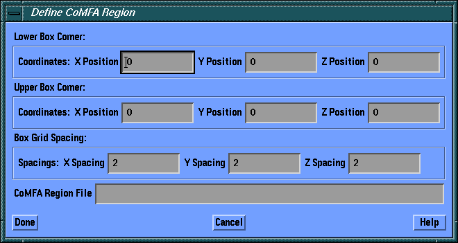 These fields represent the desired spacing in Angstroms between adjacent grid points for the X, Y, and Z dimensions of the grid region being created by the routine. Generally, CoMFA runs use between 1.0 and 2.0 Angstrom grid spacing in all cartesian directions.