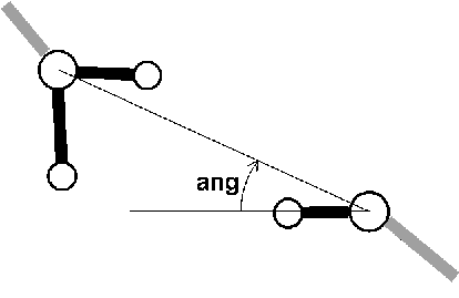 This optional component to the HINT Distance Function optimizes the approach direction of two interacting atoms. Three levels of directionality are available in the model. The lowest level, the default, is to treat all atoms as spherical with no preferred orientation for interaction; i.e., the "quality" or score of an interaction is based solely upon the distance between the interacting atoms. The second level of directionality in the HINT model is to define the bond axes of the interacting atoms as vectors defining the optimum direction for interaction. In this model, the optimum interaction would occur when the two atoms are pointed directly at one another (i.e., 0 degrees in Figure 3), and would degrade as the angle of approach varied from zero. The third level of directionality is where the lone pairs and pi orbitals of polar atoms and unsaturated atoms have explicit and scaled (to electron count) direction vectors. Optimum interactions occur when these lone pairs or pi orbitals are oriented towards suitable electron acceptor atoms such as polar hydrogens, etc. Nonpolar atoms are treated as spherical in all models.