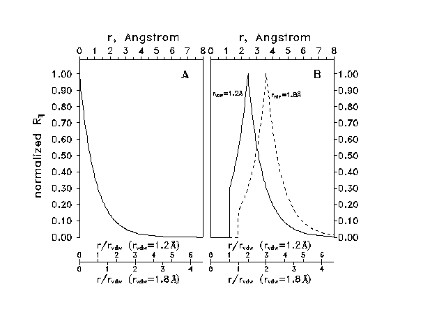 HINT allows several different custom distance functions for the interaction calculation: exponential, 1/rn and combinations of these with a Lennard-Jones 6-12 function. The electrostatic-like Rij = r-n function (for n < 3) does not decay faster than the number of interactions increases, such that artificial cutoffs (or boundary conditions) are neccessary for this function. As the goal of the HINT model is empirical rather than rigorously theoretical modeling of interactions, the HINT model does not employ boundary conditions, etc. Since the Leo polar proximity factors define a through-bond (rather than through-space) polar (and hence hydropathic) distance function, these empirical parameters were fit to a variety of through-space mathematical functions using common bond lengths and angles. The best fit was obtained for the simple exponential: Rij = e-r (See Figure 2A). This functionality was also reported by Fauchere et al. (Fauchere, J.-L.; Quarendon, P.; Kaetterer, L. Journal of Molecular Graphics 1988, 6, 203-206). Also, Israelachvili and Pashley (Nature, 1982, 300, 341.) report that the hydrophobic interaction is long range, decaying exponentially with distance on the basis of direct experimental measurements in aqeuous solutions.
