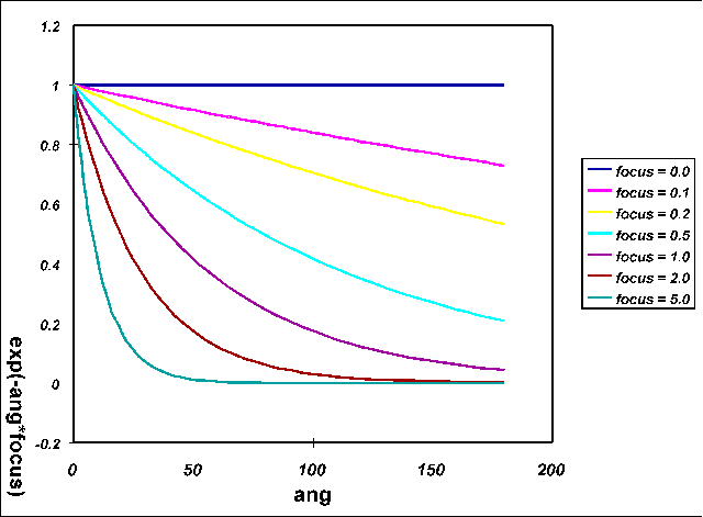 that gives the largest score for antiparallel (i.e., ang = 0 degrees) vectors. Electron_count is simply the number of electrons in the orbital(s) associated with the direction vector. This is nominally 2.0 electrons for lone pairs and 0.5 electrons for pi orbitals. Electrons present but not assigned to specific vectors are assumed to be spherically distributed at each atom. The vector "focus" parameter simply forces a smaller and tighter cone of interactions to be scored favorably (see Figure 4). Note that the trivial case of vector focus zero is identical to the spherical model for all atoms.