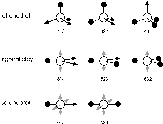 Direction vectors for lone pairs and pi orbitals are derived from the geometry of the atom and its attachments with three geometry classes: tetrahedral, trigonal bipyramidal, or octahedral. The specific case and algorithm is then chosen based on how many attachments are known and how many vectors are required. The relevent cases are coded in the following Table (see also Figure 5):