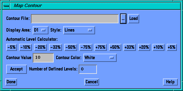 Selecting one of these buttons will place a calculated contour level into the Contour Value text box. The buttons -10%, -20%, -33%, -50%, -75% will take thet percentage of the contour minimum value (presumed to be negative); the buttons labelled +75%, +50%, +33%, +20%, +10% will take that percentage of the map maximum value (presumed to be positive). You will then choose a color and press the Accept button to proceed.