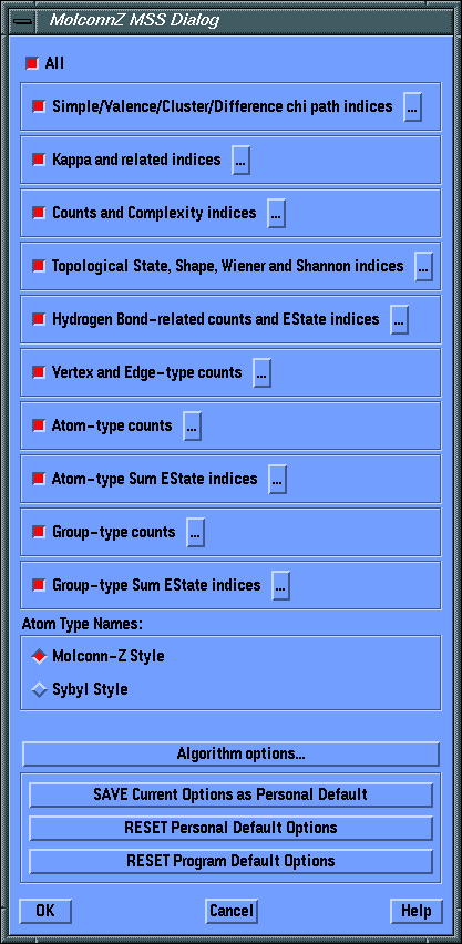 This menu gives the user a choice in how the internal Molconn-Z Atom types (for Atom-type Sum E-state, etc. calculations) are displayed for selection. The choice is between the Molconn-Z style and an adaptation of the Sybyl (TA force field) style. The choice here will not affect the calculations in any way, this option is for the convenience of the user only.