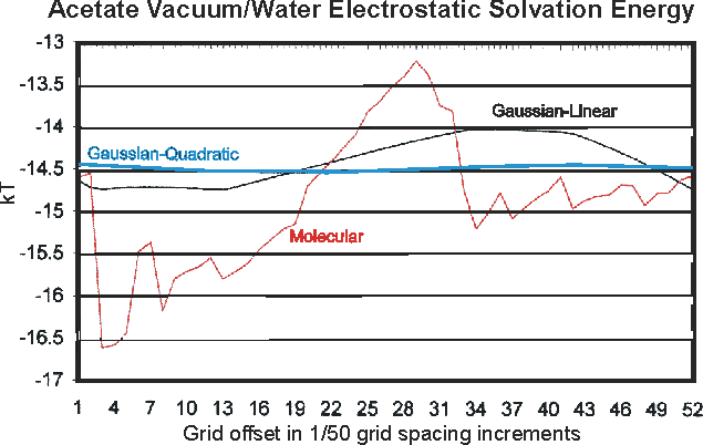 An example of the improved behavior of ZAP over DelPhi is shown in the figure below. Here we have changed the "register", i.e. the precise placement of the molecule on the grid, by successive increments of 0.02 of a grid spacing and plotted the energy due to the solvent reaction field. The DelPhi-like approach (labeled "Molecular" on the graph) leads to a jagged, almost random-walk line. The two ZAP curves represent different ways of mapping the molecular charge on to the grid. The older, DelPhi-like method leads to a curve that still retains some kinks and has substantial variation. When the new ZAP method (quadratic interpolation) is used the variation becomes smooth and almost negligible.