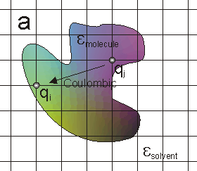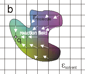 The most basic electrostatic quantity is the electrostatic potential. The potential at a charge can be considered to be comprised of three terms: the Coulombic potential from all the other charges (figure a), the reaction of the solvent to the charge (figure b), the reaction of the solvent to all the other charges (figure c).